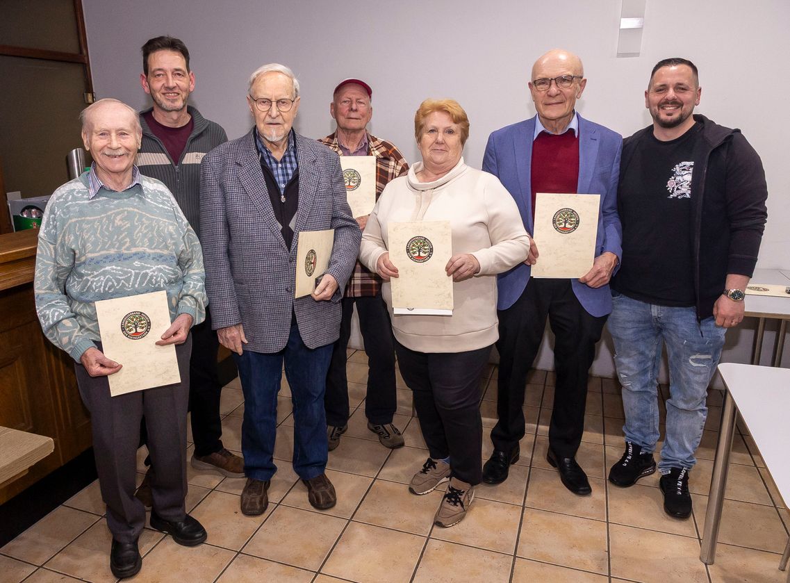 Auf dem Bild (Quelle Axel Hampe) Die Geehrten (in Klammern die Mitgliedsjahre) Horst Bodensohn (65), Vorsitzender Norbert Scherer, Gerhard Reng (50), Heinrich Hildner (25), Maria Kaufmann (25), Walter Böhm (50), der neue Kassierer David Castellino